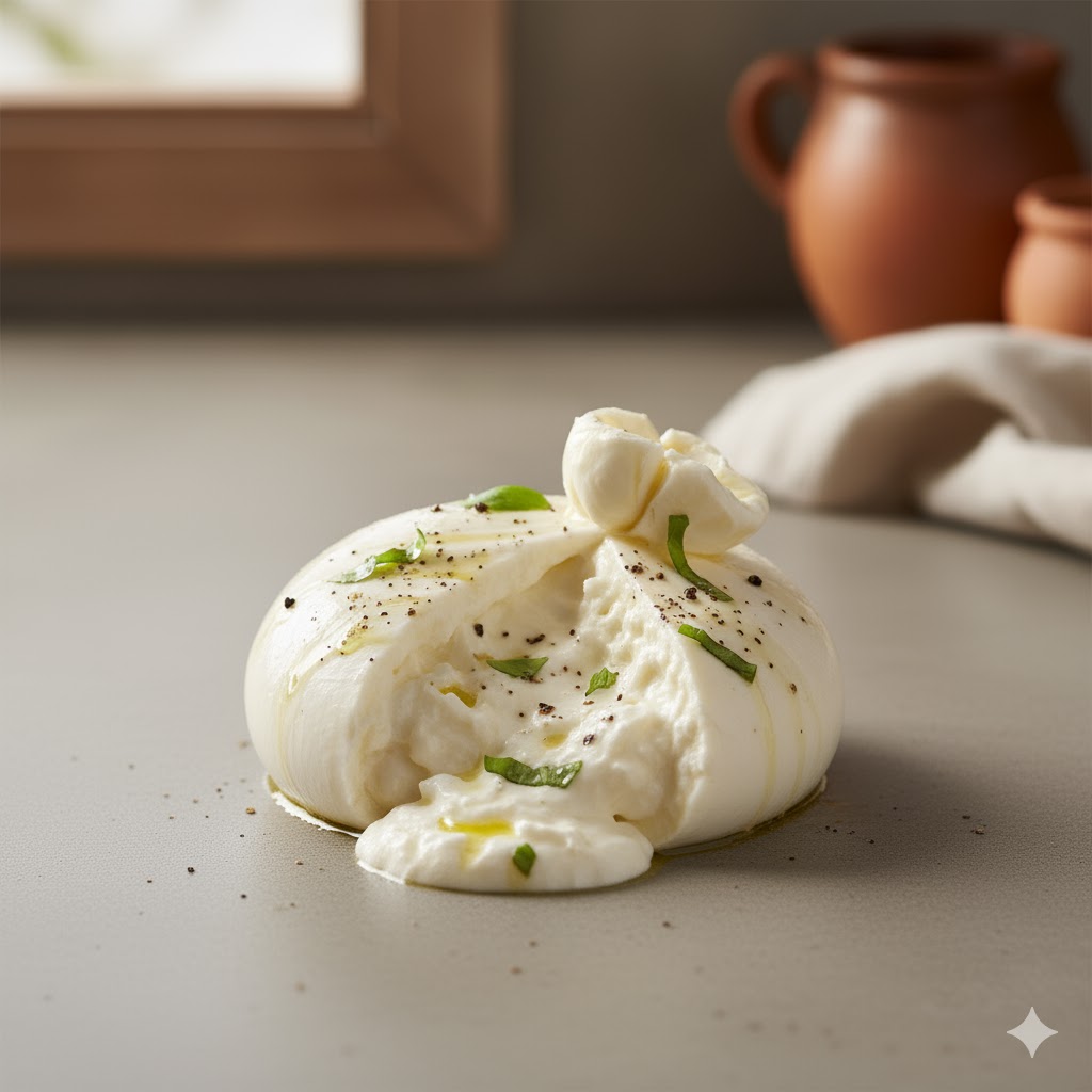 Burrata cheese is a fresh Italian cheese made from mozzarella and cream, featuring a soft, creamy center encased in a smooth outer shell. Rich, delicate, and buttery, it’s best enjoyed fresh with olive oil, tomatoes, or crusty bread.